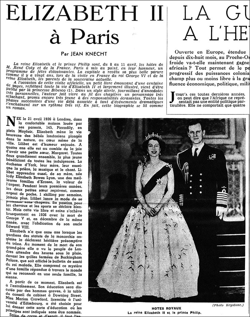Ou celui de la fastueuse visite à Paris de la reine Elizabeth et du prince Philip, en avril 1957 :