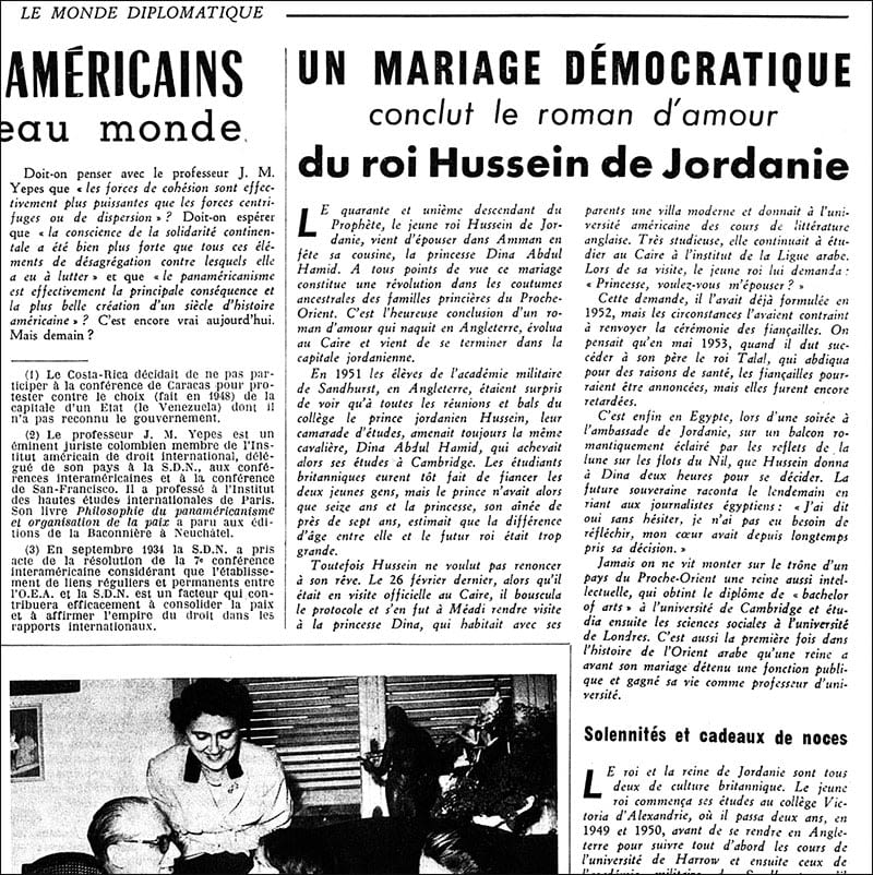 On y trouve également le récit des noces royales entre le souverain Hussein de Jordanie et la princesse Dina Abdul Hamid, en 1955 :